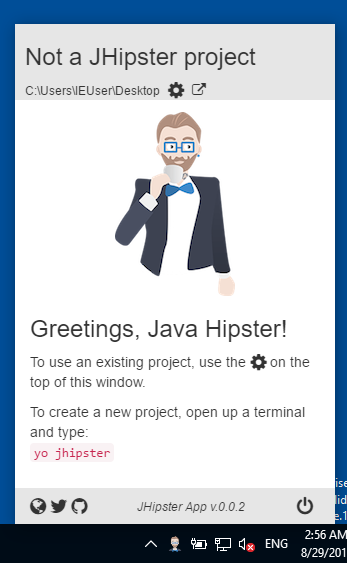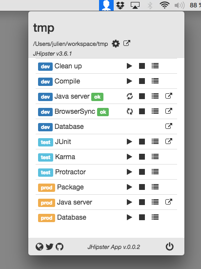 The JHipster App lives in the menu bar, and helps running the most usual JHipster tasks.